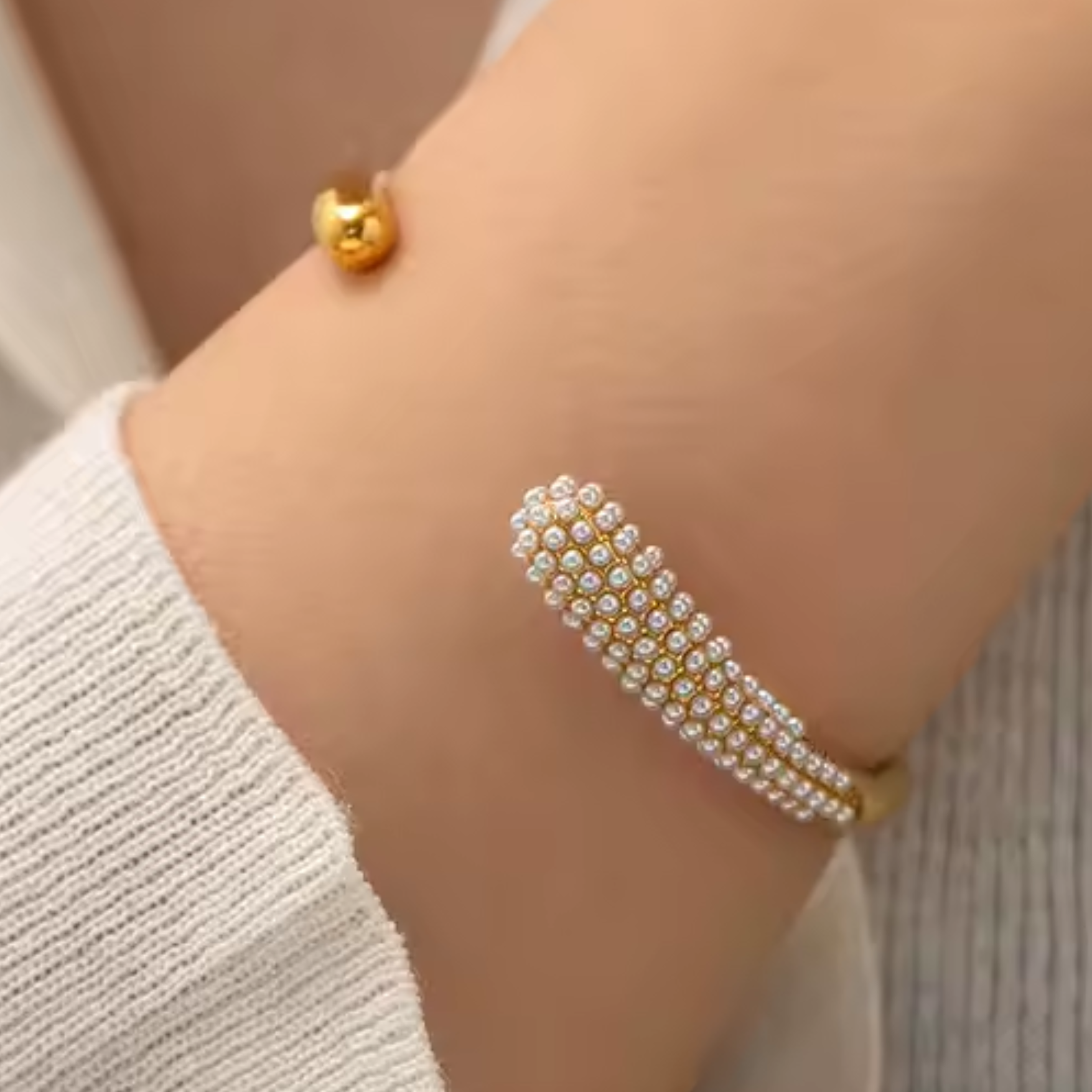 - Design: Golden bangle adorned with multiple small pearls, reminiscent of coral formations