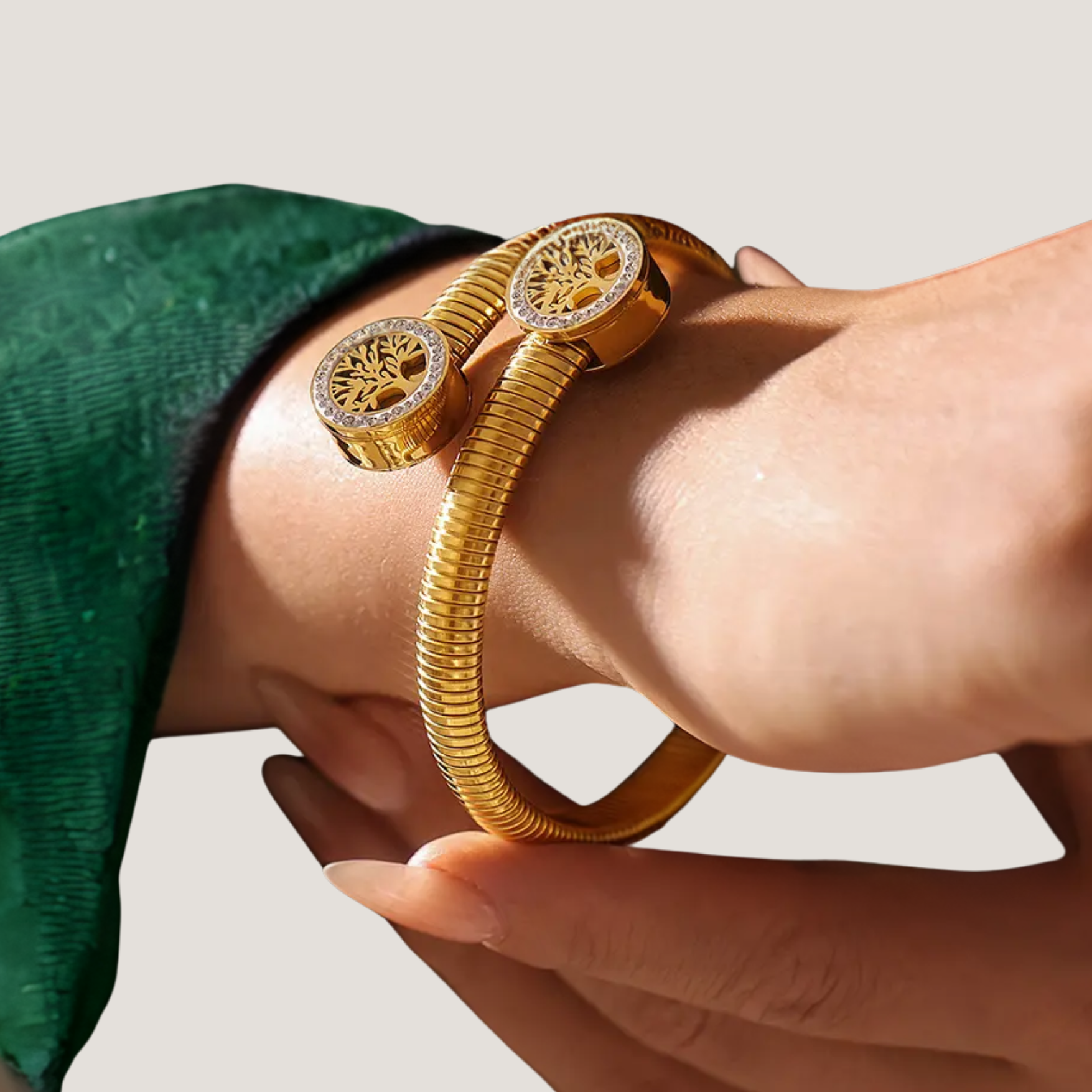 - Design: Spiral bracelet with a snake chain and Tree of Life motif