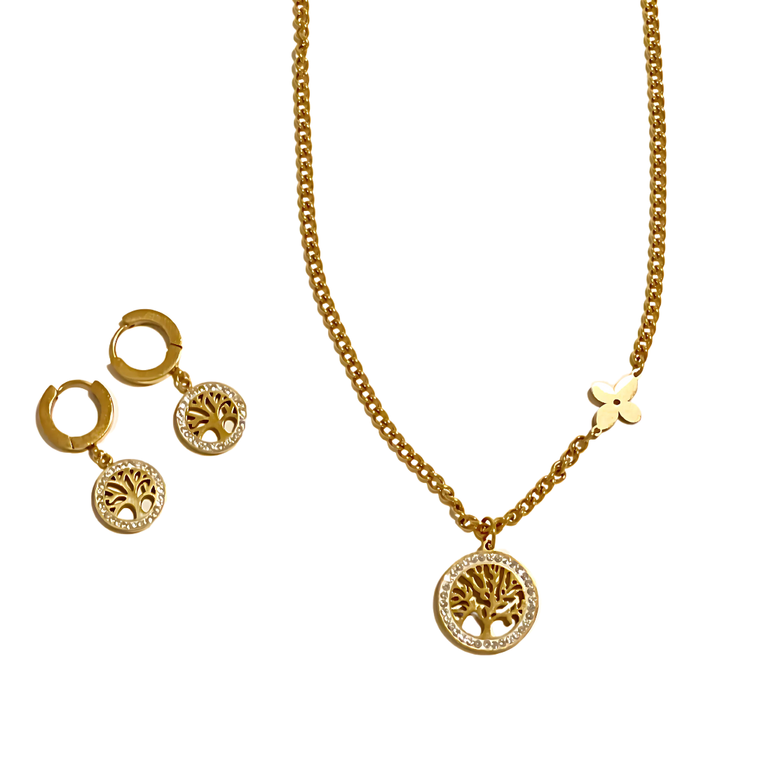 The Tree of Life Set is a timeless symbol of growth, connection, and inner strength. Featuring a matching necklace and hoop earrings, each piece showcases a delicate Tree of Life charm that intertwines elegance with deep meaning.